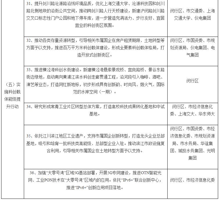 1.提升科创街区服务能级。优化剑川路和沧源路双创街区核心功能,鼓励国有、民营等各类主体进行载体改造升级,形成形态多元、体系完备的科创载体空间。实施环高校周边环境提升工程,建设剑川路科创大道、横泾港科创水街和环高校公园带,提升开放式街区形态和品质。
