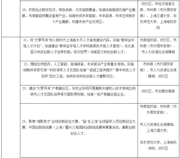 3.实施创新创业人才汇聚计划。设立创新创业人才支持计划,以赛事、项目、奖励等多元化形式支持和鼓励各类人才创业。依托相关高校、国家技术转移人才培养基地(东部)、闵行春申金字塔人才学院等机构,培育技术转化专业人才。结合战略需要和区域优势,探索建设科创学院,培养硬科技创业人才。