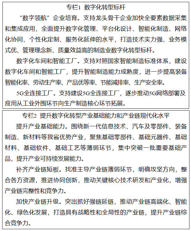 聚焦我省着力培育打造的新一代信息技术、汽车及零部件、装备制造、新材料4个万亿级产业以及现代化工、智能家电、绿色食品、钢铁和有色、光伏、节能环保、纺织服装、轻工及制成品、生物医药、新型建材10个千亿级产业,按照分行业、分区域、选龙头、树典型、重引导、全覆盖的思路,以促进制造业提质扩量增效为目标,以新一代信息技术与制造业深度融合为主线,以工业互联网平台和网络基础设施为支撑,加快全省制造业数字化转型,实现产业数字化和数字产业化协同发展,不断完善产业链,提升价值链,推动制造业高端化、智能化、绿色化发展。