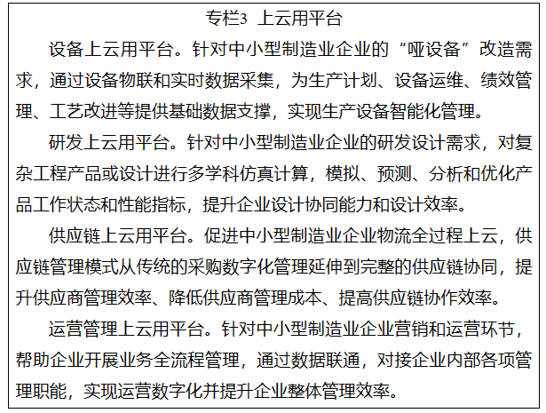 (二)中小企业数字化普及工程。依托工业互联网平台汇集一批数字化转型服务商、金融机构等,分析改造需求和融资需求,提供中小企业“用得上、用得起、用得好”的数字化解决方案。推动中小型制造业企业加快上云用平台,实施低成本、快部署、易运维的数字化改造,分行业形成一批应用成效显著的企业样板。引导细分行业中小企业参照改造样板,标准化、高质量、低成本快速推动中小企业数字化改造。通过“羚羊”等工业互联网平台,加快推广中小企业数字化软件服务包。到2025年,全省工业互联网平台普及应用率达到45%,企业工业设备上云率达到30%。(责任单位:省经济和信息化厅)