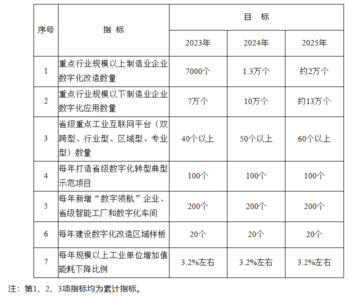 从2023年起,每年新增省级重点工业互联网平台10家以上,打造省级数字化转型典型示范项目100个,新增“数字领航”企业、省级智能工厂和数字化车间200个,建设数字化改造区域样板20个,规模以上工业单位增加值能耗下降3.2%左右。到2025年,实现全省重点行业规模以上制造业企业数字化改造全覆盖、规模以下制造业企业数字化应用全覆盖,推动重点行业全员劳动生产率达到长三角平均水平,全省制造业数字化转型工作进入全国前列,制造业高端化、智能化、绿色化发展水平显著提升。
