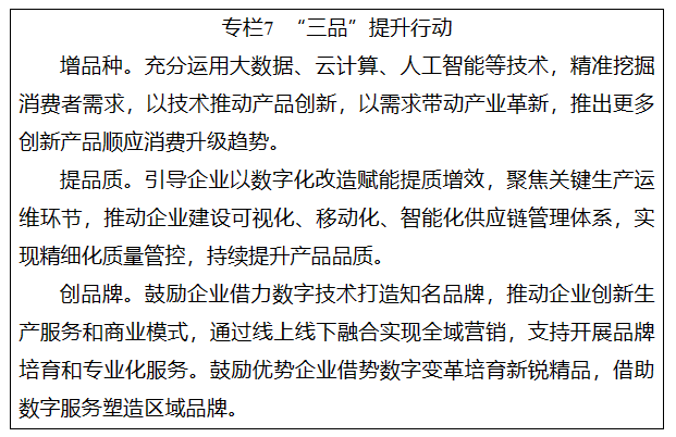 (六)制造业品质品牌提升工程。深入实施增品种、提品质、创品牌“三品”战略,发挥数字技术对传统制造业发展的放大、叠加、倍增作用,不断提升产业和企业的品种引领力、品质竞争力和品牌影响力。打造一流产品、一流企业、一流产业,开展关键技术创新、重大课题研究,支持企业主导制定国际、国家(行业)标准,培育一批专精特新“小巨人”企业和制造业单项冠军企业,推动制造业向价值链中高端迈进。(责任单位:省经济和信息化厅)