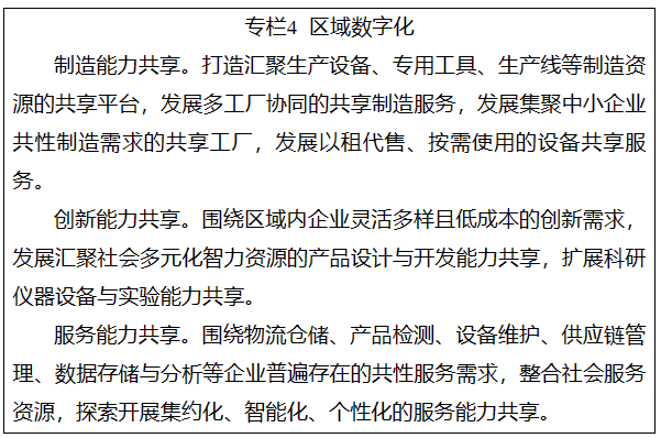 (三)区域数字化转型工程。开展“一区一业一样板”试点引领,引导省级及以上工业园区联合工业互联网平台和数字化转型服务商,针对本地优势产业,制定“一区一业一样板”的数字化转型总体工作方案,明确目标任务,加快内外网升级和数字化改造,打通数据链、创新链、产业链,鼓励有条件的地区成立数字化转型载体或平台服务公司,推动区域整体数字化转型。加快区域资源共享,支持发展中央工厂、协同制造、共享制造、众包众创、集采集销等新模式,提升区域制造资源和创新资源的共享和协作水平。(责任单位:省经济和信息化厅,配合单位:省发展改革委等)