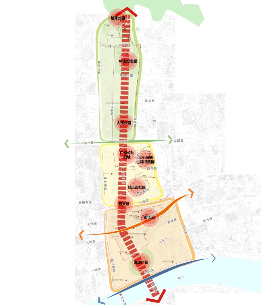 多节点:保护街区内多个历史地标、历史节点、景观节点。重点保护以越秀公园、中山纪念堂、人民公园、广州公社旧址、大小马站合族祠书院群、盐运西社区、广州起义路、高第街、海珠广场为核心的九个重要历史文化景观节点,提升周边环境,标识历史空间意象,成为近代传统中轴线重要的历史空间载体。