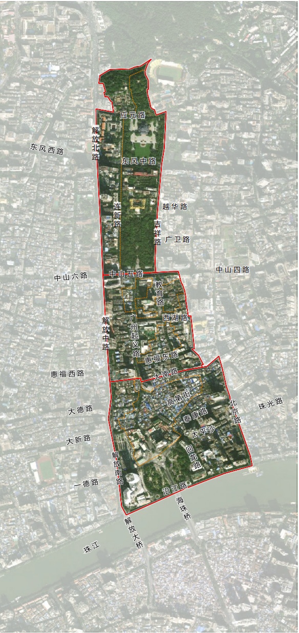 传统中轴线(近代)历史文化街区包括北段、中段、南段3个片区,其范围南至珠江岸线,北至越秀山镇海路,西至解放路,东边界经吉祥路、中山五路、小马站、惠新西 街、惠福东路、北京路,保护范围面积130.9公顷。其中核心保护范围48.2公顷,建设控制地带82.7公顷。