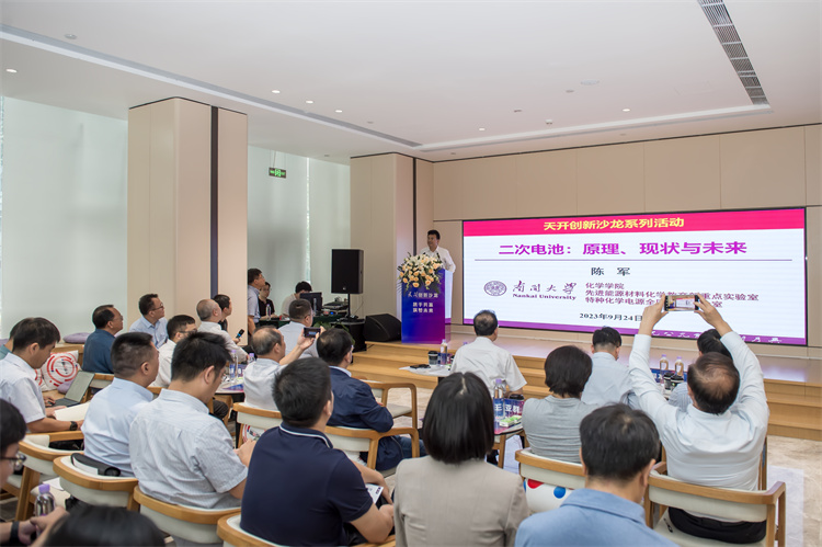 9月24日,“高安全、高比能二次电池”创新沙龙,在天开高教科创园成功举办。天津市政协副主席李剑萍出席活动并讲话。中国科学院院士、天津市科协副主席、南开大学副校长陈军教授围绕“二次电池:原理、现状与未来”作主旨报告。国家杰出青年基金获得者、南开大学教授程方益,国家杰出青年基金获得者、清华大学深圳国际研究生院长聘副教授贺艳兵,国家级青年人才、天津大学教授杨春鹏作专题报告。天津市有关部门负责同志以及来自全市有关高等院校、科研院所、重点实验室、投融资平台、重点企业等80余名专家、学者、技术经理人、企业家、在校研究生参加活动。