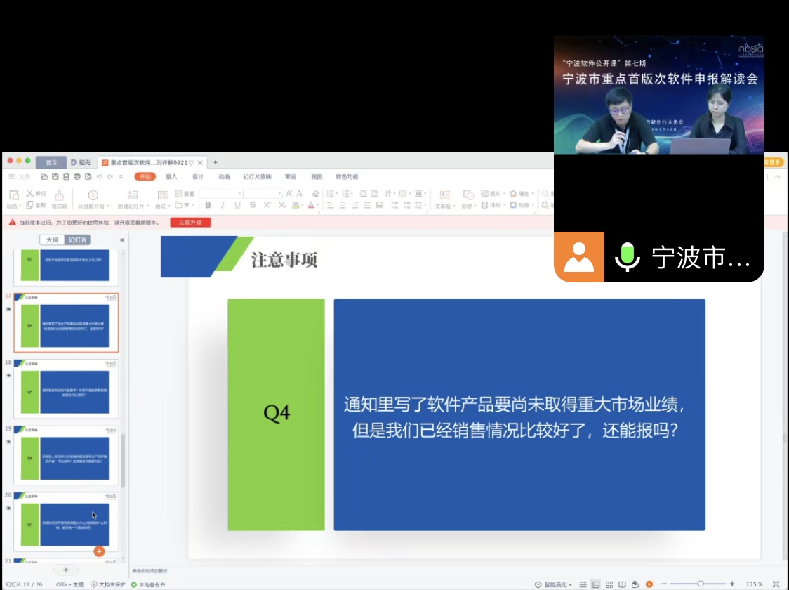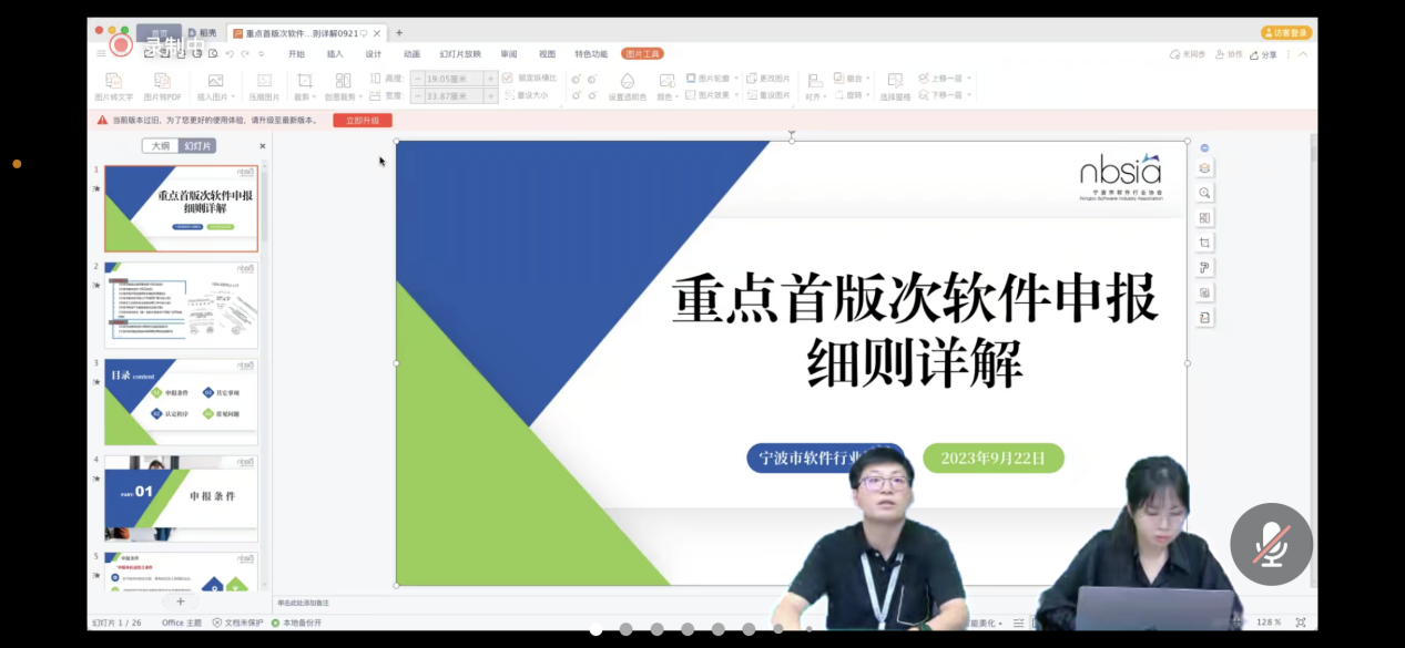 近日,市经信局印发《关于组织开展2023年宁波市重点首版次软件申报工作的通知》(甬经信软〔2023〕135号),在全市软件企业中引发热烈反响。为全面解读宁波市首版次软件政策,集中解答软件企业申报准备常见疑问,9月22日上午,“宁波软件公开课”第七期:宁波市重点首版次软件申报解读会成功举办。本次公开课由秘书长金励君在线授课,线上约 参与。