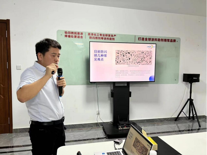 顾雷总经理以PPT的形式,向大家介绍了公司的情况,恩泽是一家集水性乳液、涂料助剂、塑料加工助剂等产品研发、生产、销售于一体的综合型企业,并详细介绍了公司在防闪锈处理上的新技术。