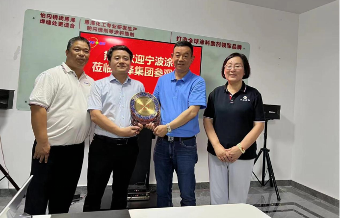 汪立波会长和吴晓明秘书长代表宁波涂协考察团一行向青岛恩泽化工有限公司顾雷总经理一行表示感谢,公司“技术创新、低碳环保、真诚服务、合作共赢”的经营理念,为客户提供配方优化与设计,从原料到成品的一站式技术服务等创新的模式和做法都值得宁波涂料企业学习和参考。