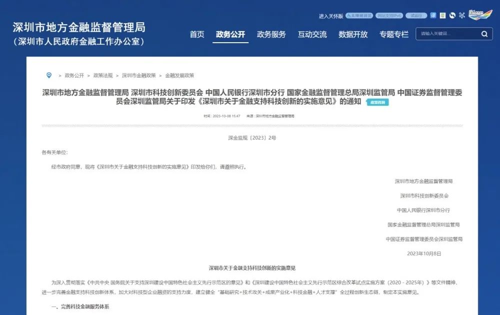 10月8日,深圳市地方金融监督管理局、深圳市科技创新委员会、中国人民银行深圳市分行、国家金融监督管理总局深圳监管局、中国证券监督管理委员会深圳监管局共同发布《深圳市关于金融支持科技创新的实施意见》(以下简称《实施意见》),其中共计有20条详细举措。