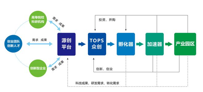 围绕服务对象从科技成果到创业项目、初创企业再到成熟企业的全生命周期,园区构建了全国唯一具有科技成果转化特色的“源创平台—众创空间—孵化器—加速器”创新创业孵化链条,形成了产学研互动合作与大中小企业融通创新、协同发展的产业孵化生态。