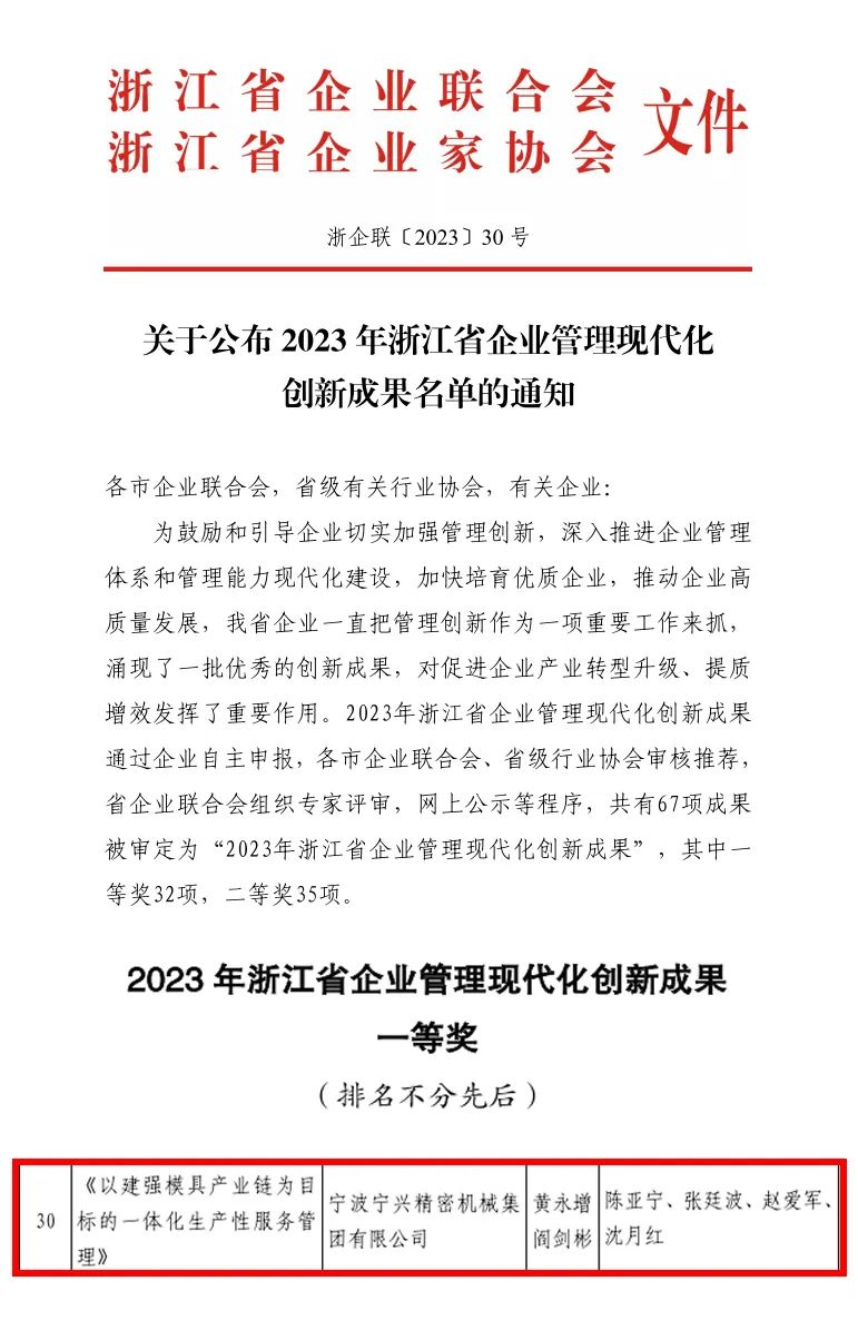 9月底,浙江省企业联合会、浙江省企业家协会联合公布了2023年浙江省企业管理现代化创新成果获奖名单,宁兴精密机械集团的《以建强模具产业链为目标的一体化生产性服务管理》荣获一等奖。