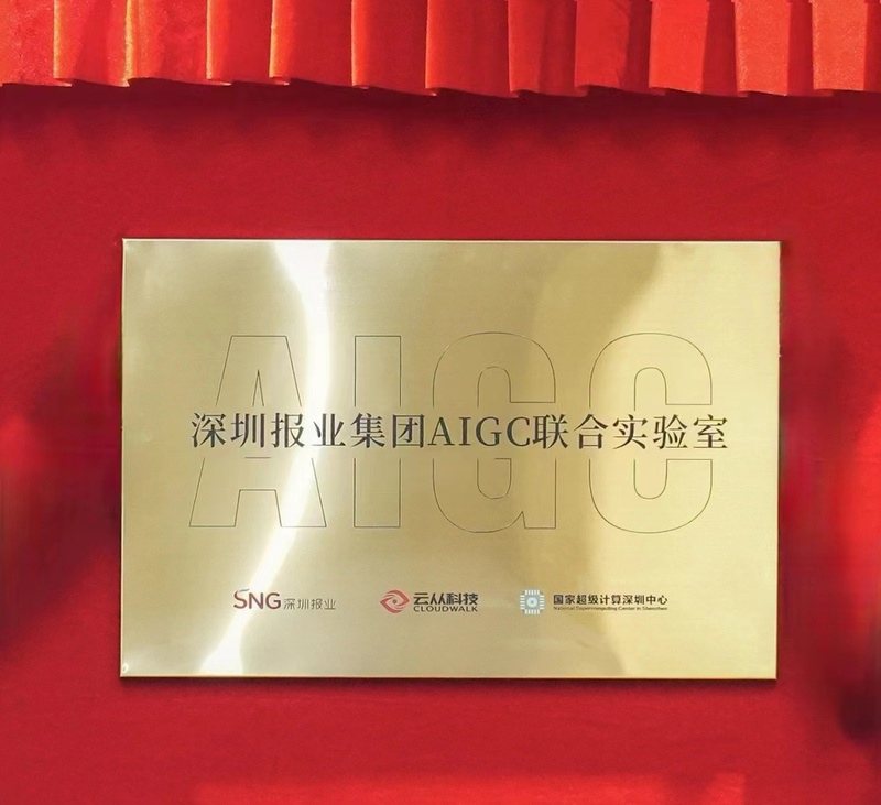由深圳报业集团、云从科技集团和国家超级计算深圳中心三方合作成立的AIGC联合实验室(以下简称实验室)在深圳报业集团新媒体大厦正式揭牌。深圳报业集团党组书记、社长丁时照,云从科技集团董事长、总经理周曦出席揭牌仪式。