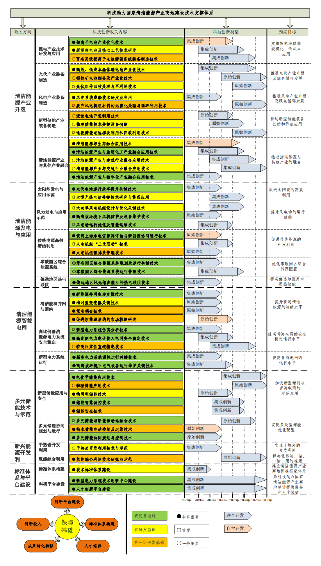 按照《青海打造国家清洁能源产业高地建设行动方案(2021-2030年)》中“加强清洁能源技术创新标准化和平台建设,提高自主创新能力和高新技术转化应用能力,形成清洁能源技术创新转化应用体系和标准体系”的工作部署,面向清洁能源科技前沿和产业共性关键技术需求,加强清洁能源生产、消费、存储各环节关键技术攻关和技术创新,大幅提高清洁能源利用技术和产业技术。加强科技创新平台建设,筹建“多能互补绿色储能全国重点实验室”,支持省级重点实验室、工程技术研究中心、技术创新中心、企业中试基地等多层次科技创新平台建设,推动产学研用深度融合。围绕清洁能源全产业链,深入实施科技型企业、高新技术企业和科技“小巨人”企业培育计划,全面落实惠企政策,打造高质量创新主体。加快构建完善新型电力系统技术标准体系,促进科技创新与标准创制互动,以标准研制促进科技成果转化。努力使青海成为清洁能源科技创新的策源地、清洁能源技术应用示范地和清洁能源人才培养聚集地,支撑清洁能源产业高质量发展。