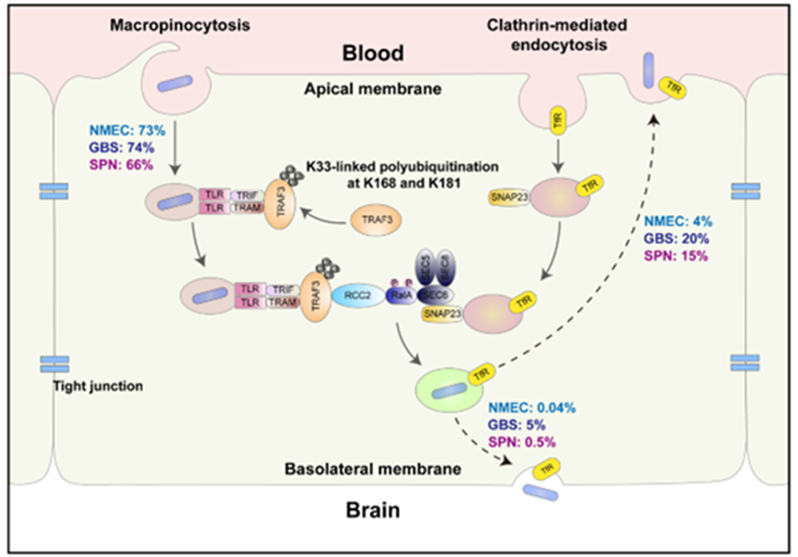 南开大学研究团队针对这一关键问题,经过多年攻关,发现主要脑膜炎病原细菌——肺炎链球菌Streptococcus pneumoniae、B族链球菌group B Streptococcus、新生儿脑膜炎大肠杆菌neonatal meningitis Escherichia coli通过劫持铁转运蛋白受体(Transferrin receptor,TfR)的胞内运输,穿越血脑屏障。研究结果提示主要脑膜炎病原细菌利用共同机制穿越血脑屏障,因此这一机制的发现为开发防治细菌性脑膜炎的广谱药物提供了理论基础和潜在靶点,同时也为递送药物穿越血脑屏障提供了新思路。
