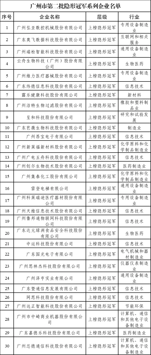 为发掘、培育和孵化一批在细分行业领域创新能力优、行业地位高、盈利水平好的“隐形冠军”企业,助力企业融入重点产业链、供应链、创新链和价值链,提升企业影响力和竞争力,实现高质量发展,在广州市科学技术局的指导和推动下,广州市产业招商投资促进会通过相关部门、行业、高校推荐、企业自荐等方式,最终遴选出第二批隐形冠军系列企业102家。