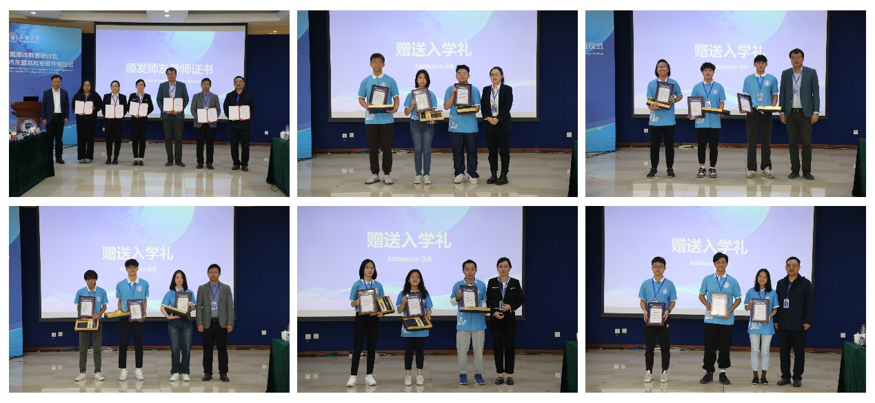 为了进一步提高东盟专班的人才培养质量,海洋学院为专班学生专门配备了“师友导师”和班主任,希望各位老师能够成为同学们的良师益友。各位专班学生依次上台,由师友导师为同学们献上导师寄语,并赠送了极具纪念意义的开班礼。专班同学纷纷表示,在学校及社会各界的大力支持下,在学院老师们的悉心指导下,一定会不负所望、努力学习,未来成为具有全球视野创新能力的一流海洋人才!