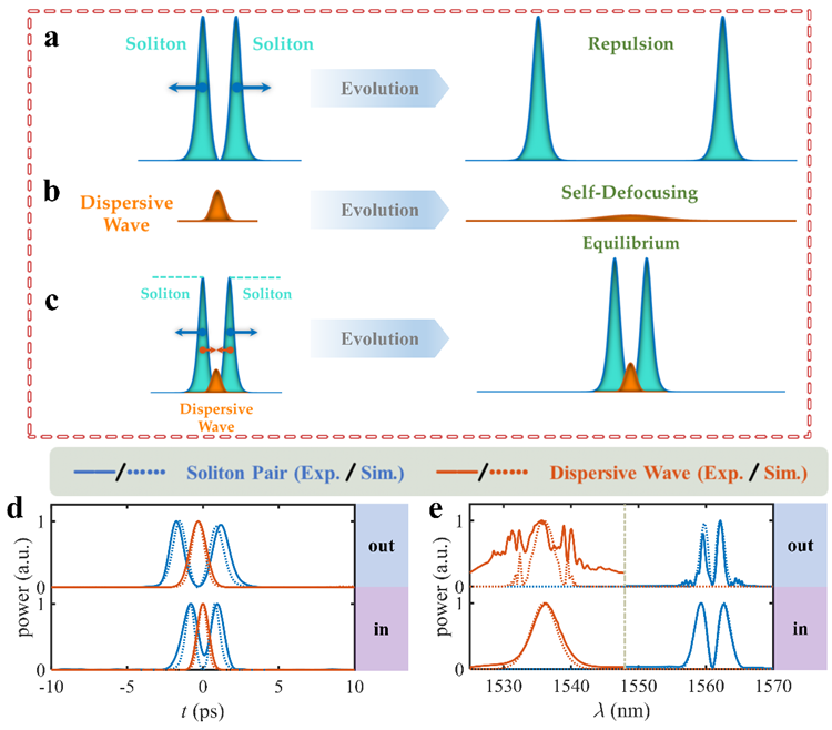 图一:(a-c)两个孤子和一个色散波通过非线性相互作用形成脉冲复合体的示意图;(d,e)实验实现的脉冲复合体:(d)时域形貌和(e)频谱分布
