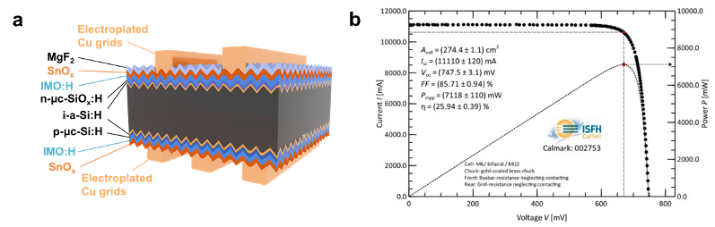近日,南开大学电子信息与光学工程学院张晓丹教授和赵颖教授课题组,与苏州迈为科技股份有限公司和澳大利亚金属化技术公司SunDrive共同合作,首次在室温下通过溅射技术制备了廉价且可量产的未掺杂氧化锡(SnOx)薄膜,并以此替代电池中的铟基透明电极。另外,SnOx薄膜具有良好的化学稳定性,通过将SnOx与IMO:H(氢化过渡金属掺杂氧化铟)进行1:1结构的叠加,改善了薄膜的电学性能和其与载流子传输层之间的接触电阻,从而提高了电池的性能。为减少SHJ太阳电池中另一种贵金属——“银”的耗量,在电池金属化环节采用了铜电镀工艺,通过提升电极高宽比提高电池转换效率,同时省去了昂贵的银浆成本。最终,以低铟透明电极结合电镀铜电极的形式,获得了25.94%的ISFH认证效率(电池总面积为274.4 cm2),是目前已发表的“低铟”SHJ太阳电池研究中的最高效率。