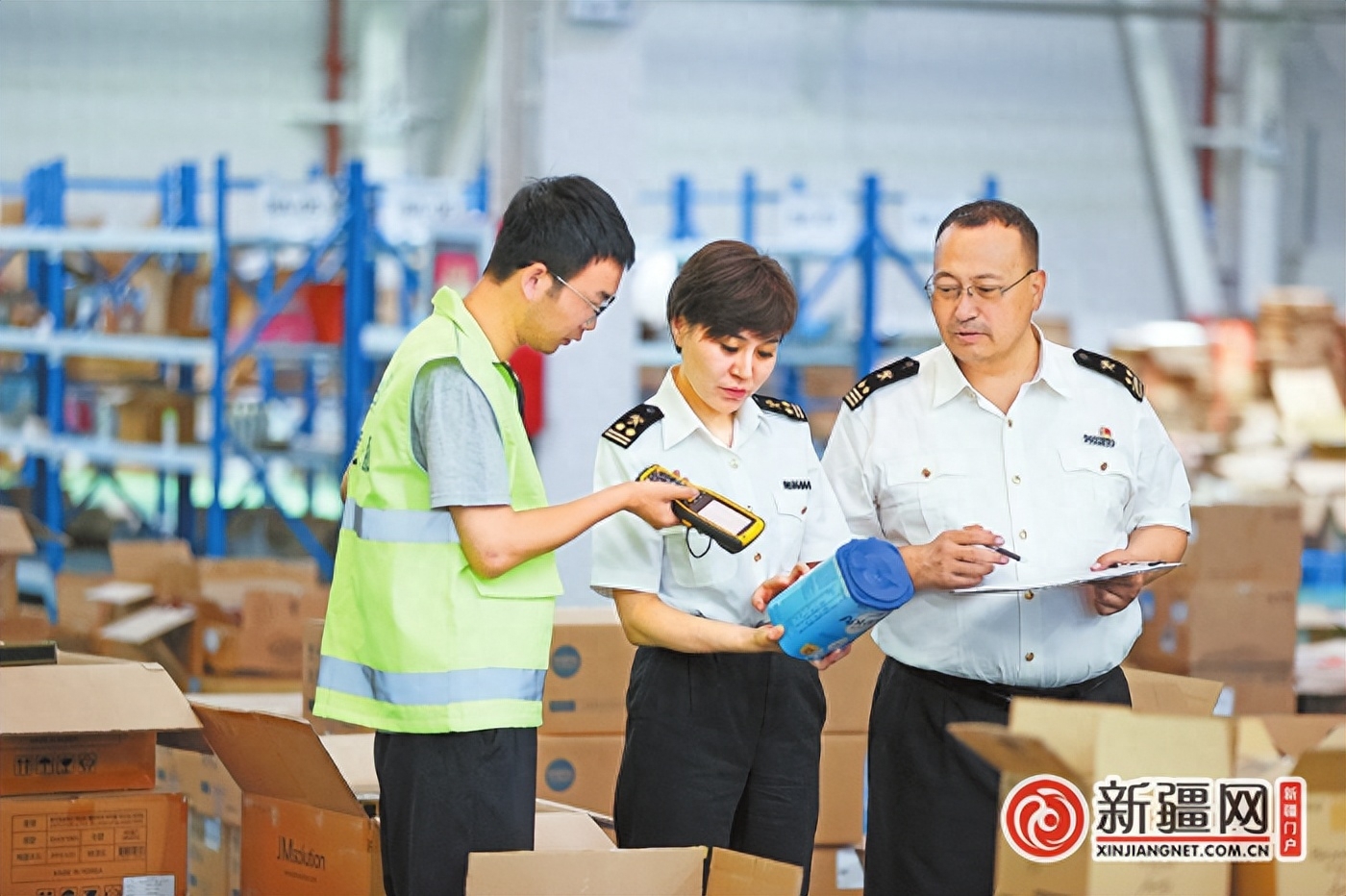 乌昌海关关员在乌鲁木齐综合保税区跨境电商监管中心查看跨境电商保税进口商品。