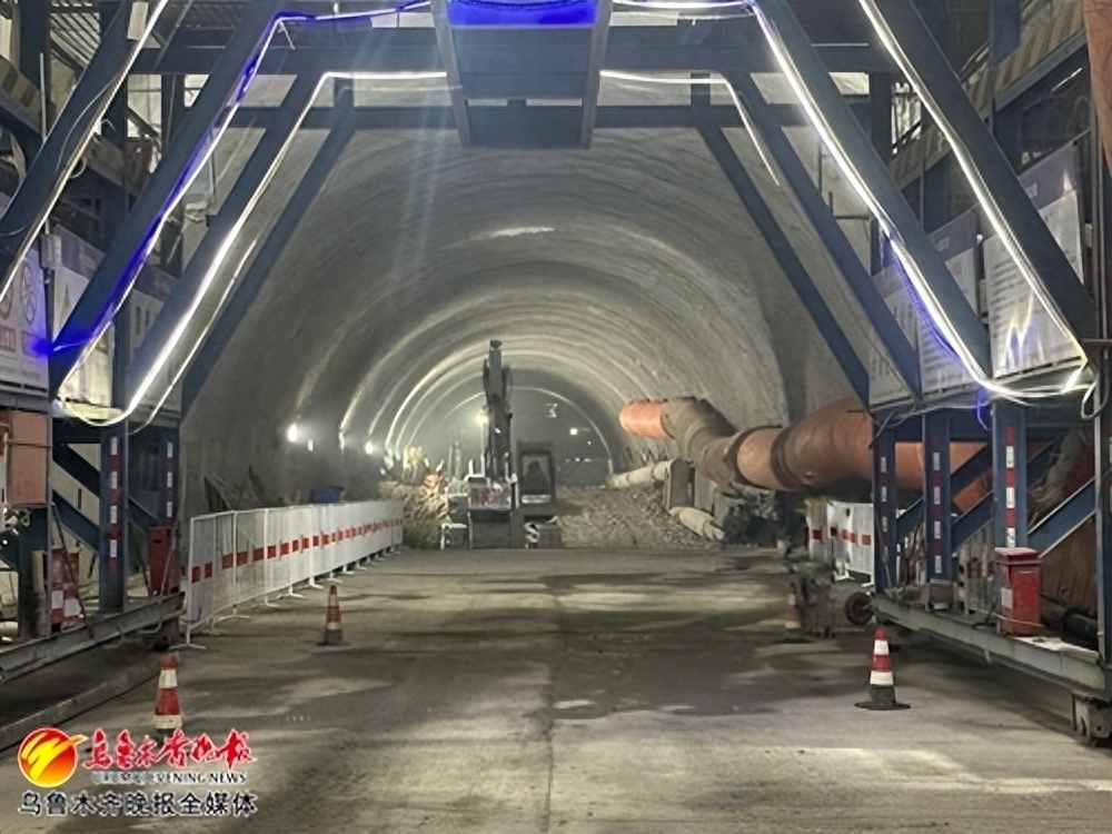 G0711线乌鲁木齐至尉犁高速公路项目哈熊沟隧道内施工场景。记者马婷 通讯员孙智勇摄