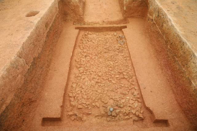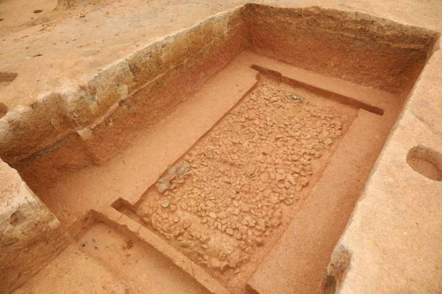 王慧分析,镬盖顶岭墓葬规模仅为印山越王陵的约十分之一,斜坡墓道北向,年代则晚至西汉南越国时期,就墓葬形制来说应存在早晚承袭的关系。长方形竖穴土坑墓室底部铺砌石床,也是继承了江浙两周土墩墓的习俗。