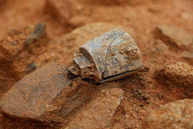 广州市文物考古研究院调查勘探部助理馆员、遗址现场负责人谷俊杰介绍,2023年4月—7月,为配合国有土地出让,广州市文物考古研究院对这一地块进行了考古调查勘探工作,在地块内的镬盖顶岭发现了灰坑、柱洞、灰沟等遗迹和曲折纹、勾连云雷纹、方格纹等几何印纹硬陶片,初步判定分布镬盖顶岭有春秋战国时期文化遗存。