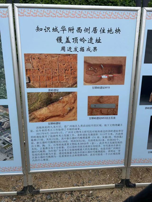 2017年8月—2018年1月,广州市文物考古研究院对地块南边的茶岭遗址和甘草岭遗址展开了抢救性考古发掘工作。茶岭遗址发掘面积3113平方米,共清理墓葬177座,其中新石器时代晚期墓葬174座,出土铜、陶、玉、石等质地重要文物标本300余件(套),是年度广东省考古发掘规模最大的先秦遗址,也是目前广州地区发现的遗存最为丰富、遗迹现象最为复杂的新石器时代晚期遗址,表明这一带在新石器时代晚期是一处重要的生活和埋葬场所,甚至可能是一个小区域范围内的中心聚落。