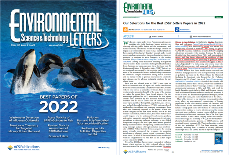 ES&T Letters 2022年最佳论文奖公布于2023年10月10日出版的最新一期杂志封面及编辑发布的社论文章