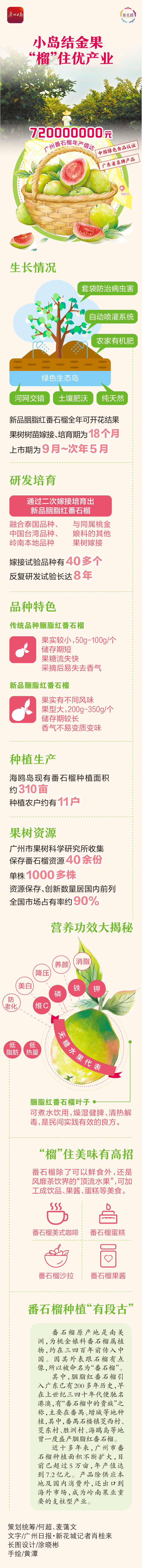 广州市番石榴种植面积超5万亩,年产值达7.2亿元,除供应本地及国内消费外,还出口到海外市场,已成为岭南果业重要的支柱型产业。在番禺区海鸥岛上,新农人培育出胭脂红番石榴的新品,采用绿色栽培,使用科技种植,依托直播带货,探索深度加工,岭南人所说的“鸡屎果”成为了“致富果”。此外,岛上休闲农业旅游、科普旅游得到不断发展,农场采摘受到市民游客欢迎。这一幕幕成为推进“百千万工程”、以特色农业发展促进乡村产业振兴的生动写照。