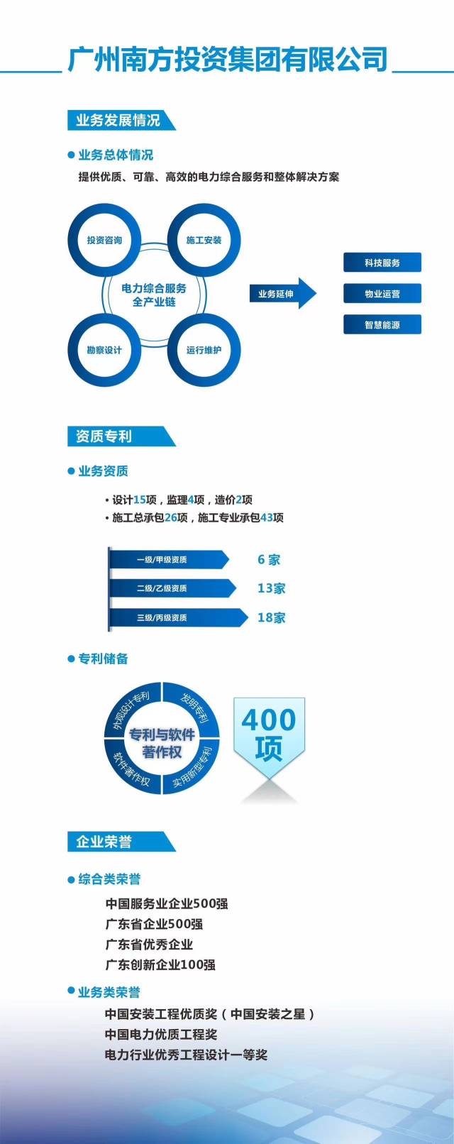 南投集团于1999年成立,主营电力建设、工程咨询服务、科技服务和智慧能源、物业运营四大业务领域,聚焦电网、用户侧、低碳城市三大业务场景,具有电力行业资质等级高、业务范围广、市场占有率高、全产业链电力综合服务、低碳新能源、数字化技术领先等优势,是南方电网系统广东地区电网建设领域的龙头企业。