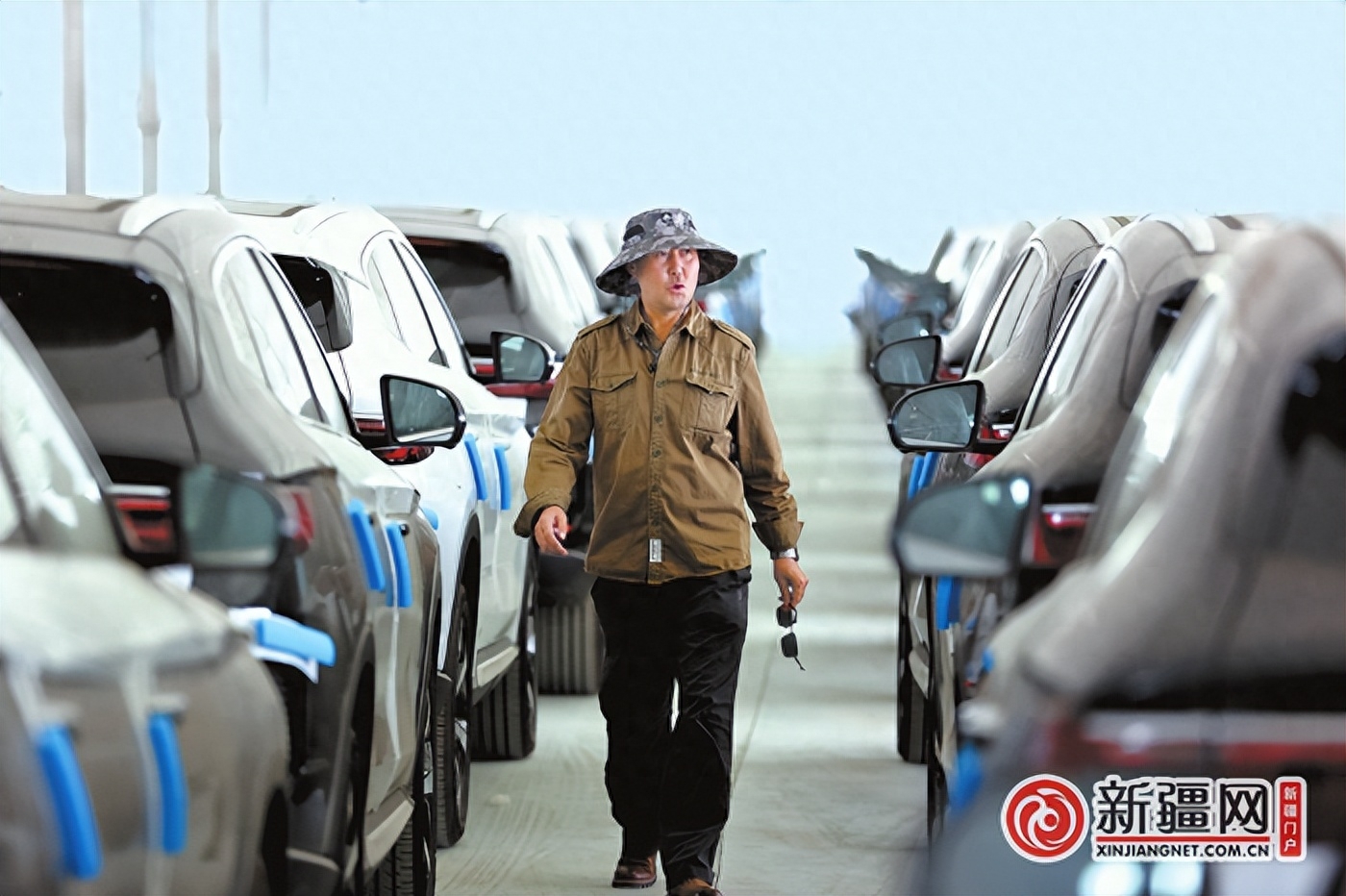 在乌鲁木齐综合保税区,工作人员正在查看准备出口的比亚迪汽车。(全媒体记者石磊摄)