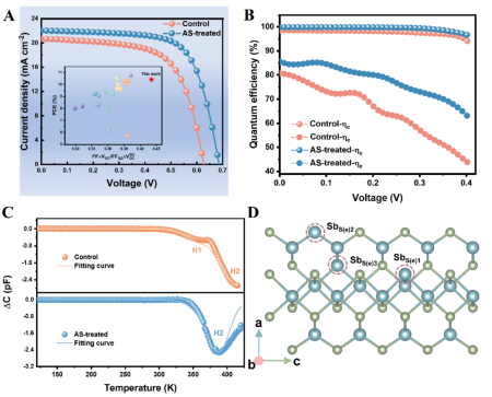 图A 基于对照和AS处理的Sb2(S,Se)3太阳电池J-V曲线(插图为Sb2(S,Se)3太阳能电池PCE和FF×VOC/FFSQ× VOC,SQ的对比图);B 相应器件在不同偏压下载流子传输效率和载流子萃取效率图;C 器件的DLTS谱图;D Sb2(S,Se)3晶格中的反位缺陷示意图