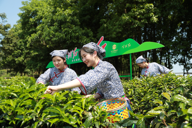 岭头“黄埔红”红茶创意园里,茶农正在采摘新茶。