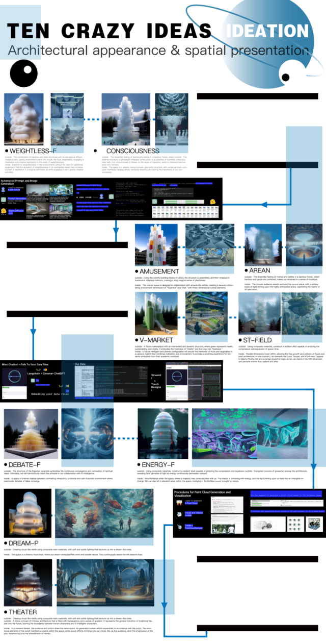一个月的跨学科联合课程和想象有不少出入,小组的同学们虽然背景各异,但是我们相处很自然开心,从最开始想要从“寺庙热”做年轻人解压疗愈的虚拟寺庙到后面的校园建筑AI设计,虽然时间紧张,项目选题也有较多的变动,但是大家心态很好,有问题就不断调整,最后展陈的每一部分也是我们共同努力的组合。