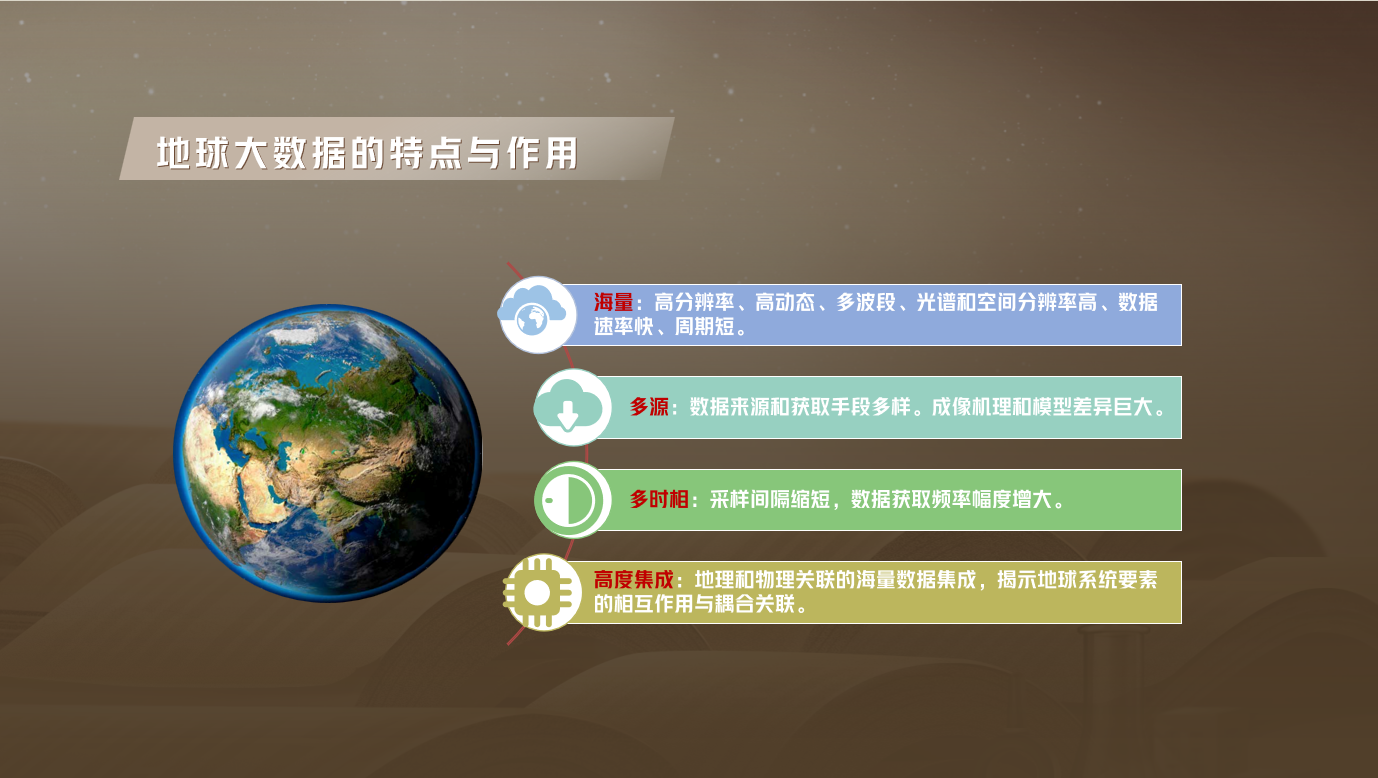 为此,我国科学家瞄准“地球大数据”展开一系列科研攻关。“大数据是破解科学难题的宝贵资源,催生人们用全新的模式来实现科学发现。”郭华东院士表示,地球大数据是利用对地观测为主的数据,具备海量、多源、异构、多时相、多维度、高耦合度、非平稳以及非结构化等特点,正在成为认识地球的“新钥匙”、知识发现的新引擎和决策支持的新手段。
