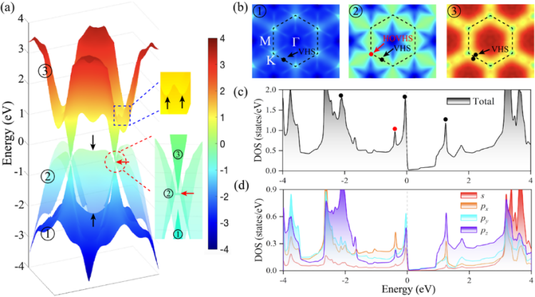 图2. 双层Kagome硼烯的电子结构及van Hove奇点(黑色箭头代表传统van Hove奇点,红色箭头代表高阶van Hove奇点)。
