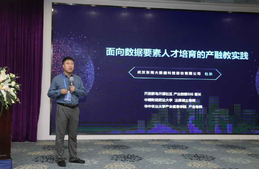 武汉东湖大数据科技股份有限公司总经理杜乐作了《面向数据要素人才培育的产融教实践》主题报告,重点阐述了数据要素的价值、数据要素人才产融教的生态体系与实践、数据要素人才产融教思维。