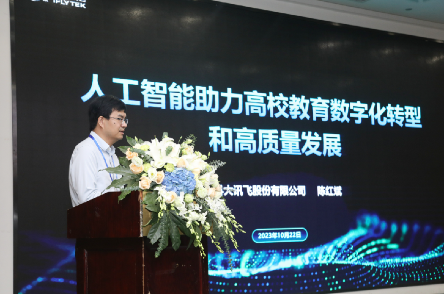 在专题报告环节,科大讯飞股份有限公司副总裁陈红斌作了题为《人工智能助力高校教育数字化转型》主题报告,并现场演示了讯飞星火认知大模型的各项功能。模型围绕“知识问答、代码编程、数理推算、创意联想、语言翻译”等实用场景,通过海量文本、代码和知识学习,可实现基于自然对话方式的用户需求理解与任务执行。
