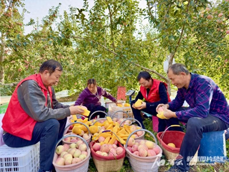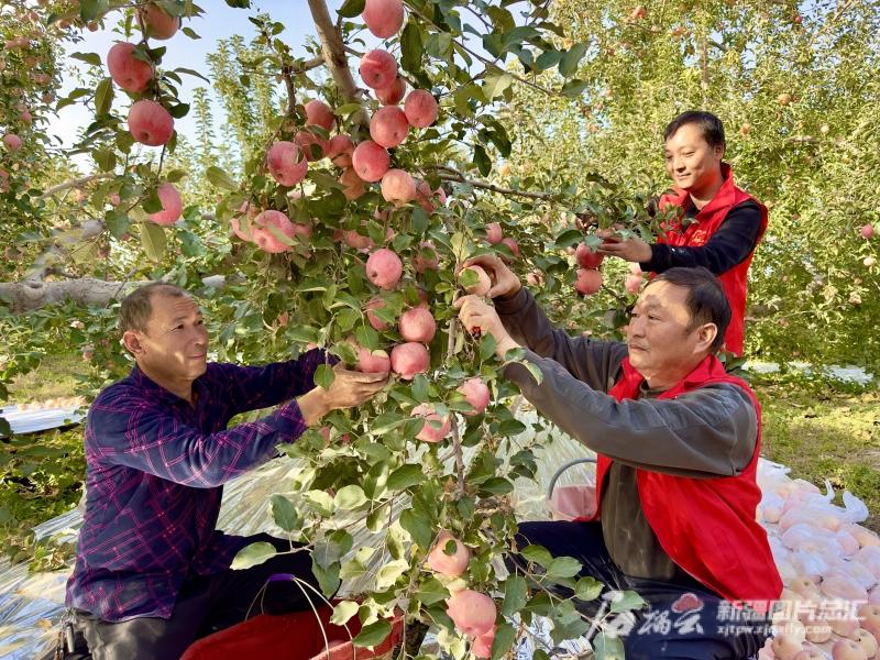10月22日,温宿农商银行驻克孜勒镇博然其村工作队队员帮助村民采摘苹果。艾则孜·沙木沙克 摄