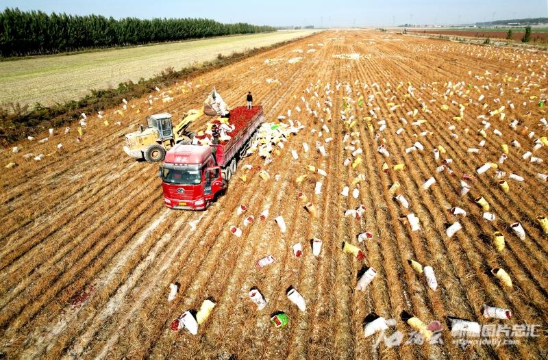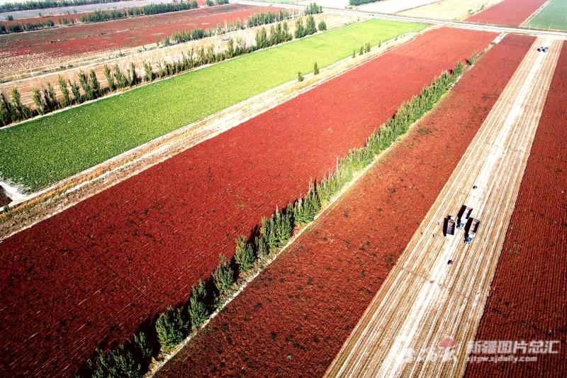 金秋时节,焉耆垦区各团场职工种植的19.9万亩色素辣椒迎来收获季,火红的辣椒铺满田间,构成了一幅田野丰收图。
