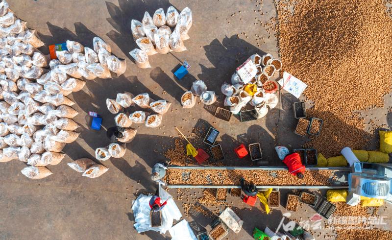 10月23日,合作社员工在分装核桃(无人机摄)。袁欢欢 摄