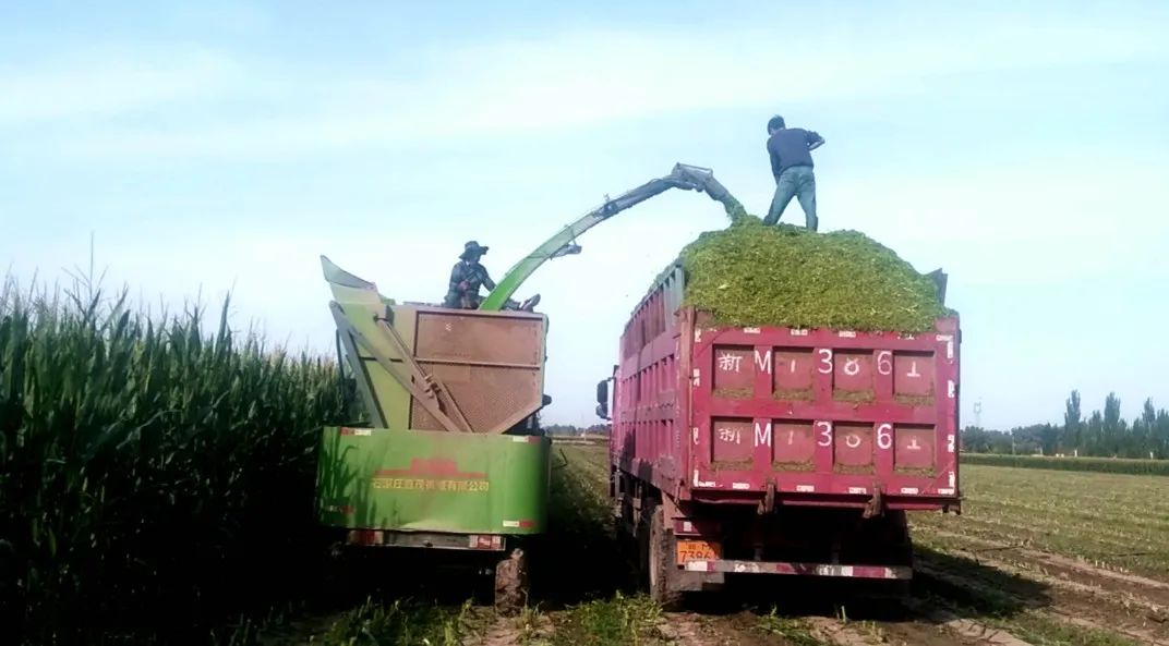 在古勒巴格村村民崔永在家的青贮玉米地里,一辆青贮收割机和大货车正默契配合,来回穿梭在青贮玉米地中。一株株玉米被收割机连茎带穗卷入机器,经过搅碎揉搓,变成青贮饲料装入货车,这些装满的青贮饲草的货车将送往古勒巴格乡库克喀依那木村养殖大户热合曼·克乃木的畜牧养殖合作社中。