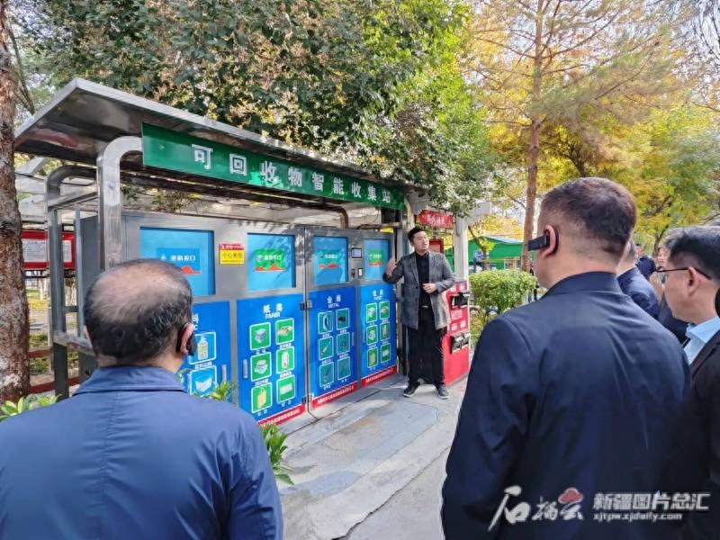 10月14日,在奎屯市团结街道海纳尔社区,工作人员正在向参观者介绍可回收物智能收集站的功能。天山网/新疆日报记者 王亚芸摄