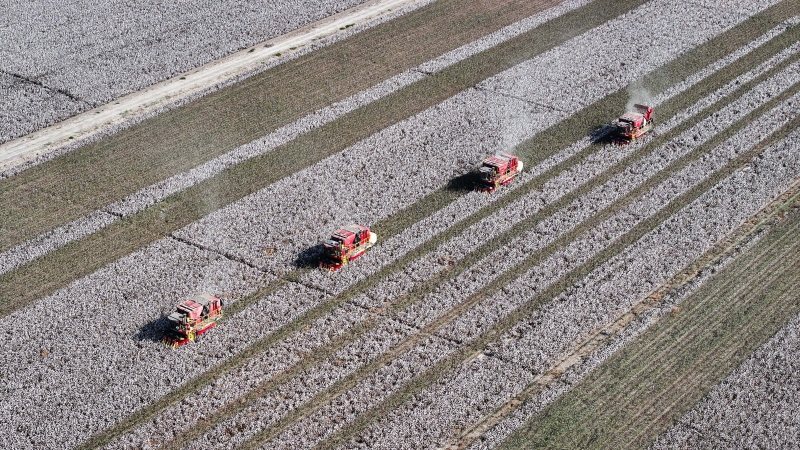 10月12日,在库尔勒市普惠农场一处棉田,农民驾驶大型采棉机采摘棉花(无人机照片)。新华社记者 李响 摄