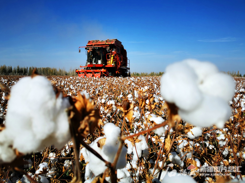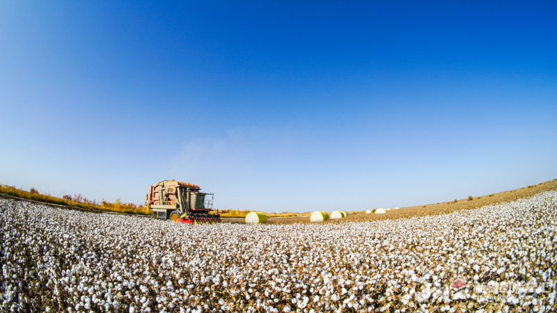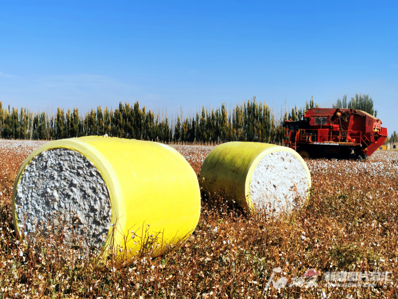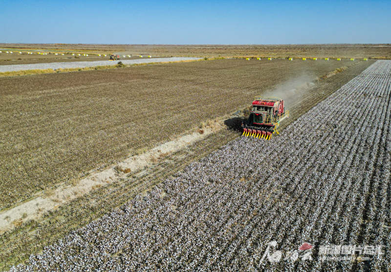 眼下,尉犁县种植的105万亩棉花进入采收期,采棉机穿梭在棉田里采摘、压缩、打包“一条龙”作业。