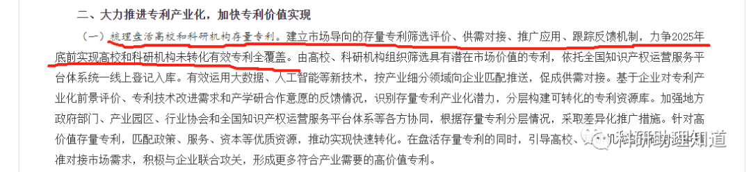 国务院办公厅关于印发《专利转化运用专项行动方案(2023—2025年)》的通知中提到,梳理盘活高校和科研机构存量专利,建立市场导向的存量专利筛选评价、供需对接、推广应用、跟踪反馈机制,力争2025年底前实现高校和科研机构未转化有效专利全覆盖。