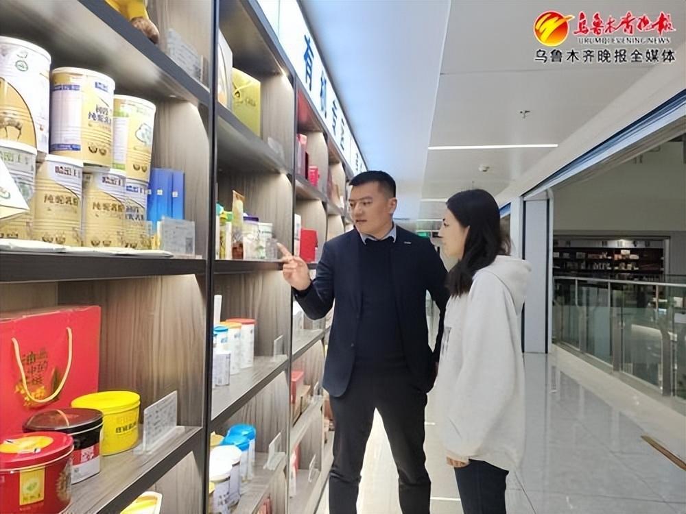 11月1日,在位于乌鲁木齐站翼展天地的新疆农业电商总部基地,新疆好心情供应链有限公司负责人李璟正在给客户介绍农副产品。记者唐红梅摄