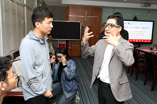 企业相关工作人员为学生们演示“听语者”字幕翻译眼镜的使用方法 来源:天津理工大学