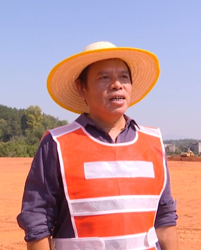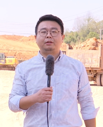 我现在是在大路乡东坑村通山大道的施工现场,在我身后大家可以看到,大型机械来回穿梭,一派热闹繁忙的施工景象。